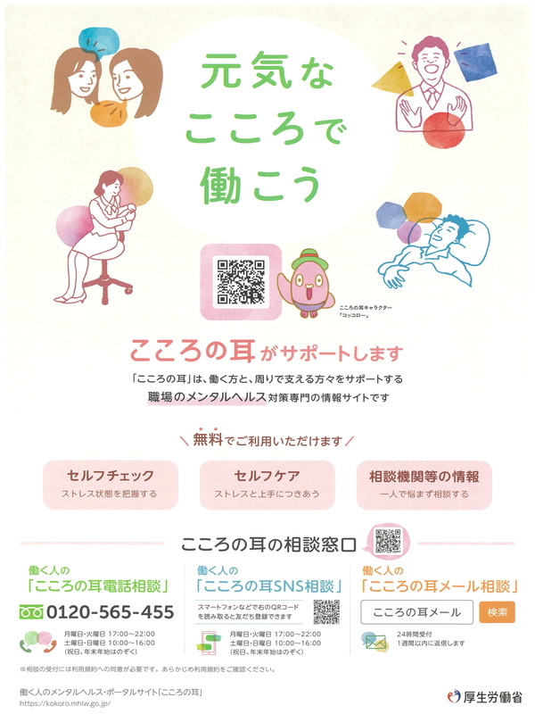 メンタルヘルスケアは、セルフケア・ラインによるケア・産業保健スタッフによるケア・事業場外資源によるケアの4つがありました。職場内だけではなく、多岐にわたり相談をさせていただける場所があると、とても嬉しいことだと思います。従って定期的にメンタルケアを行い、明日の自分や明日一緒に仕事をする仲間と楽しく笑顔で業務に取り組めるように、皆様にもメンタルケアをおすすめ致します。